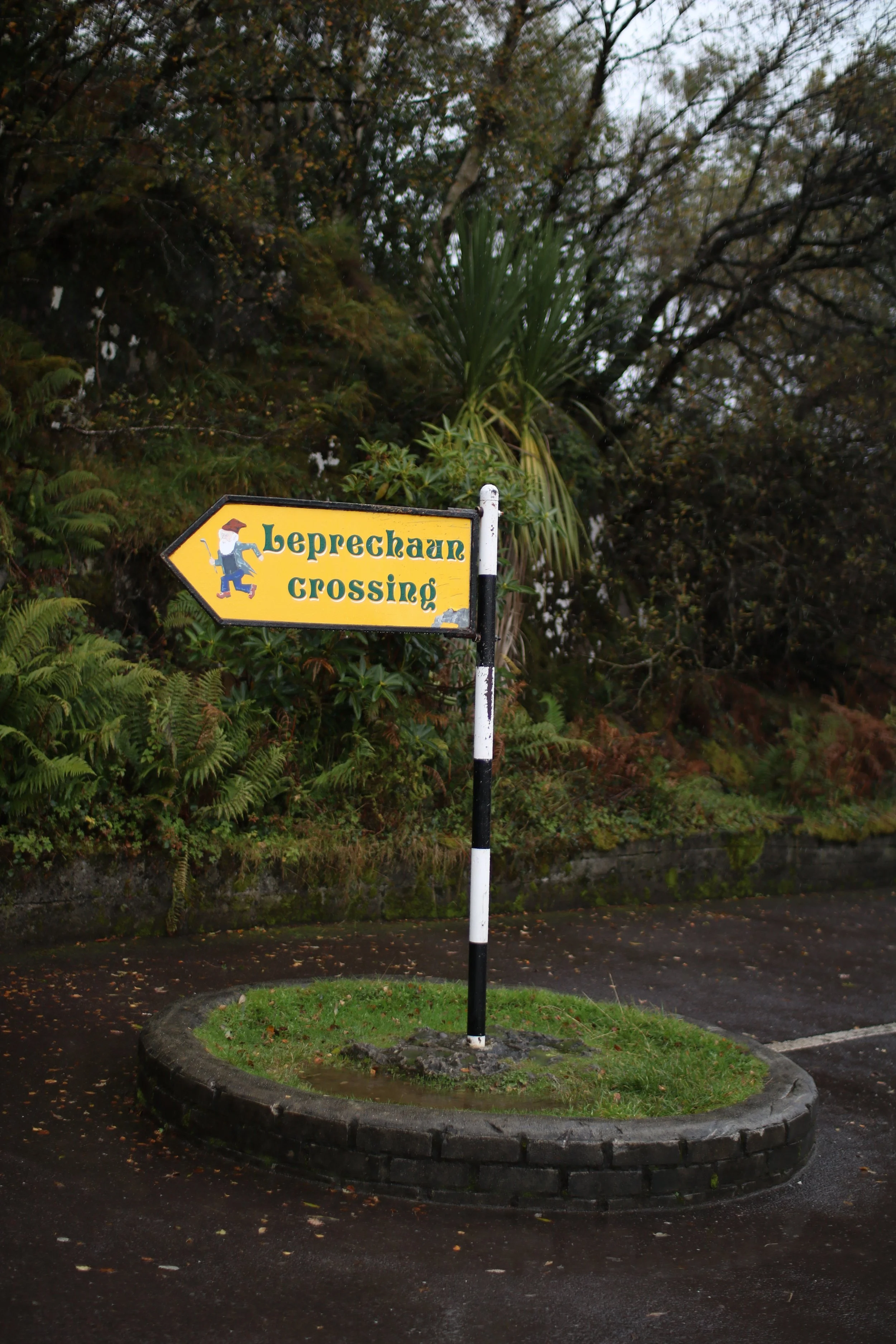Following the Gap of Dunloe, we stopped at Ladies View. The day we went was misty and slightly foggy day making it hard to see lots of the view but what we could see was beautiful! Behind the lookout there is a Leprochaun Crossing sign that we saw on a post card a few days earlier thinking it was a funny joke, not realizing it was an actual sign!